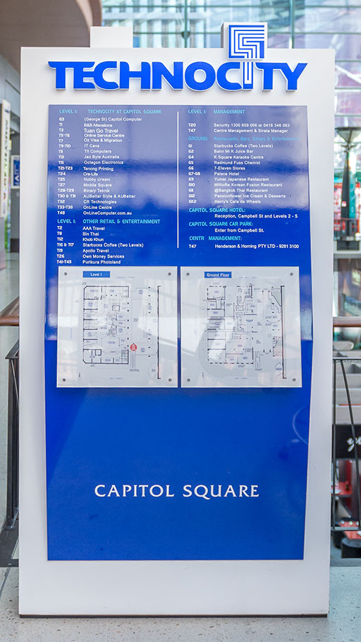 Technocity gives you what all IT shoppers want – very competitive prices from keen involved IT retailers. Even the CBD shopfront for one of Australia’s top on‐line computer retailers. Service and repairs is offered either on site or by specialist service people. Students needing some lanquage back‐up will also be at home at Technocity. Check out the “other” lanquage capabilites of our retailers – and the Capitol Square food, services and entertainment businesses while you are with us. You can stay overnight if you wish at Capitol Square Hotel!